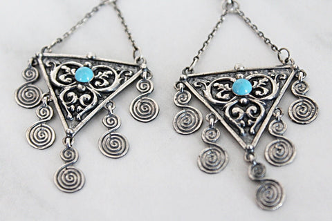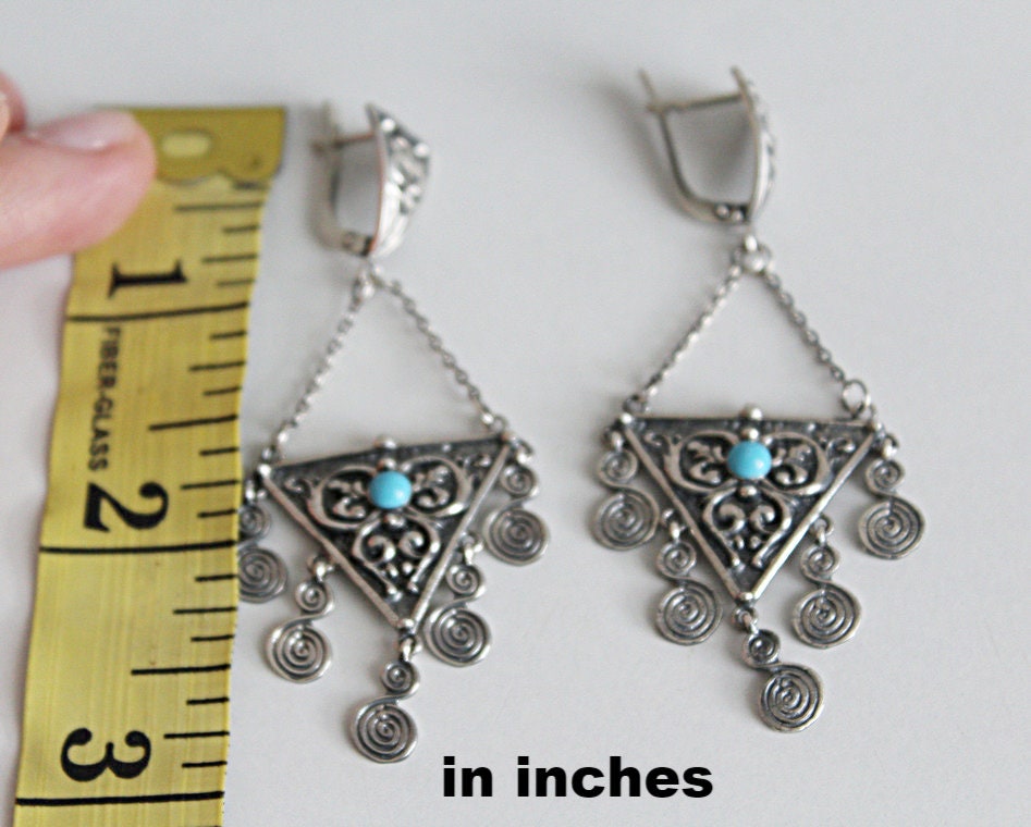 Indulge in the elegance of traditional Armenian jewelry with our high-quality, silver chandelier earrings. These beautiful light blue earrings are inspired by Western Armenian designs and perfectly match folk taraz dresses. Elevate your style with our intricate and stylish Bohemian accessories. As a leading expert in the jewelry industry, we pride ourselves on providing top-notch and trustworthy products. Our jewelry is hypoallergenic and perfect for sensitive skin. Enjoy free worldwide shipping when you shop, one of the most reputable and highly rated online jewelry stores.