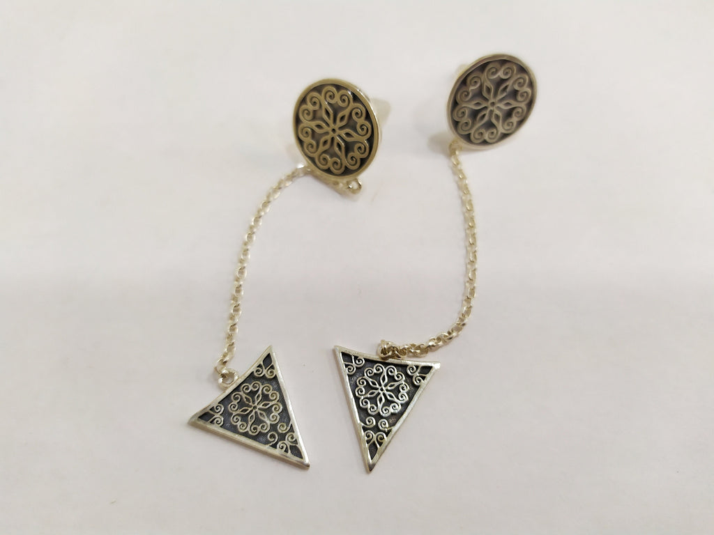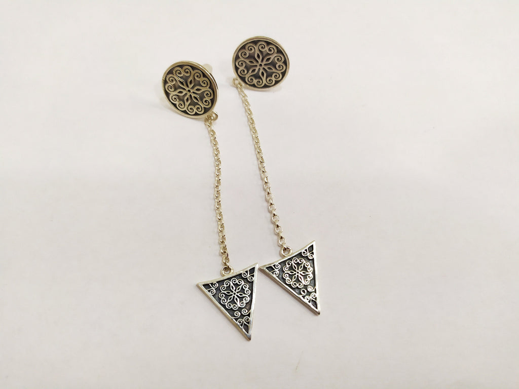 These sterling silver earrings feature a delicate floral pattern and are handcrafted in Armenia. With their long chains, they add a touch of elegance and sophistication to any outfit. Made of 925 silver, they are the perfect addition to any jewelry collection.