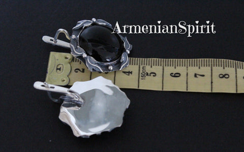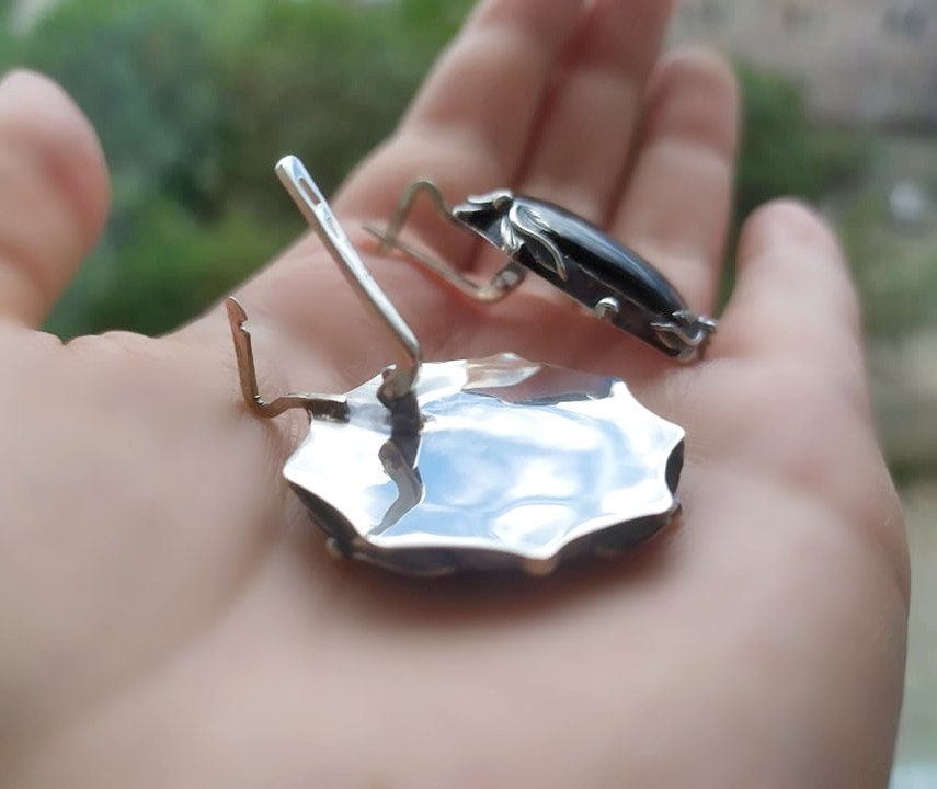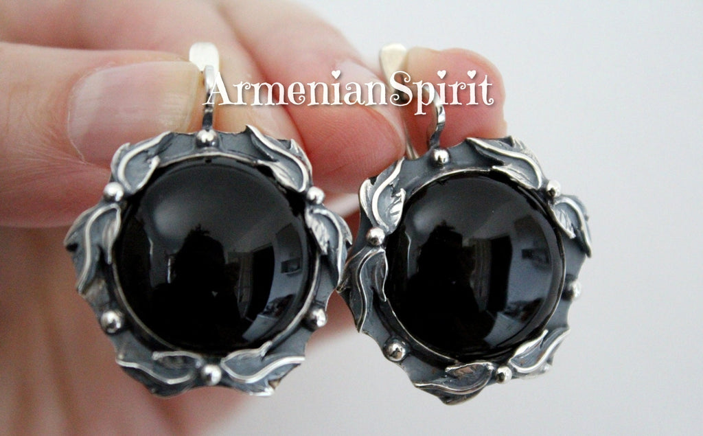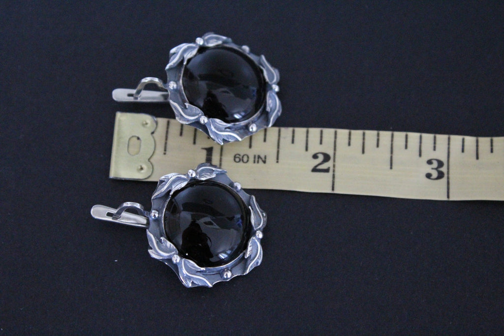 Add a touch of vintage elegance to your style with our black round onyx earrings. Handcrafted by artisan jewelers, these mid-century inspired pieces feature stunning black onyx stones and intricate flower silver detailing. Perfect for any occasion, these earrings are the best find. Matching ring is also available.