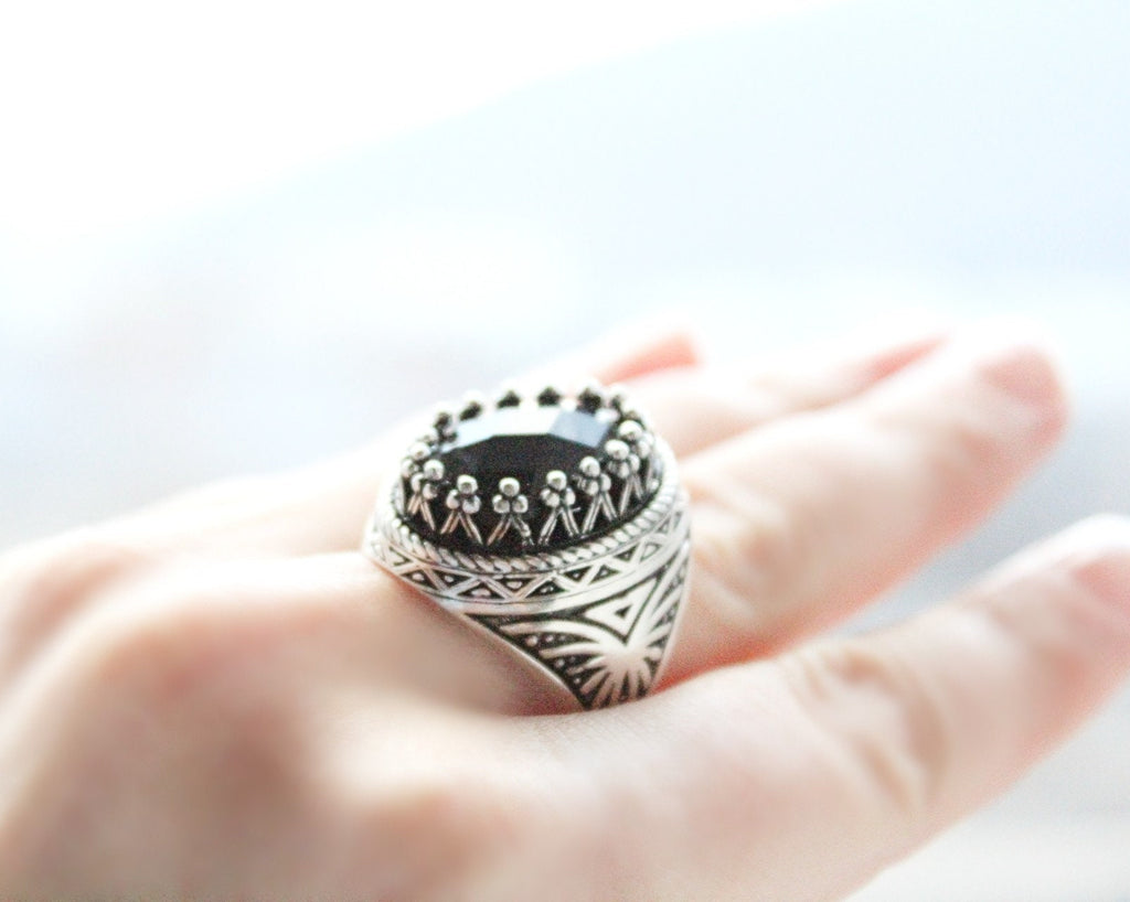 This elegant black silver ring, crafted from 925 sterling silver and featuring a striking onyx stone, offers a timeless addition to your jewelry collection. Designed with hypoallergenic silver, it ensures comfort for sensitive skin while adding a touch of royal sophistication to any outfit. Perfect for those seeking both style and skin-friendly wear.