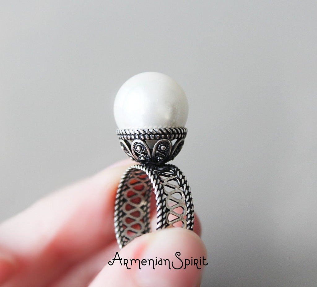 Elevate your style with our vintage inspired 925 silver ring, featuring a stunning lab large white pearl. Handcrafted by Armenian artisans, this retro wedding jewelry is adjustable for the perfect fit. Say hello to unique and high-quality jewelry from our Armenian Spirit collection.