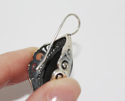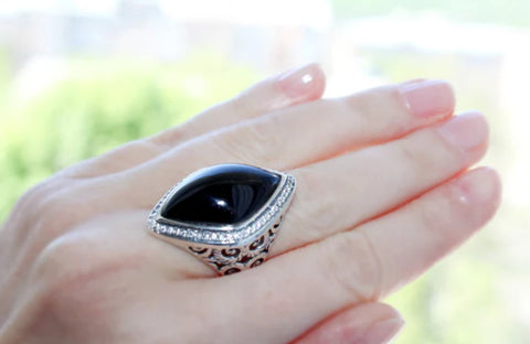 Black onyx gemstones framed by sparkling white zircon accents define this sophisticated pairing in authentic 925 sterling silver. Hook-style rhombus earrings extend 3.5 cm, weighing 14 grams, complemented by an 8.6-gram ring. Retro 70s aesthetics inform the bold yet refined silhouettes. Each piece balances vintage inspiration with contemporary wearability. Hypoallergenic materials ensure comfortable extended wear. These accessories command attention while maintaining versatile appeal across occasions. Ideal for collectors valuing distinctive design or memorable tokens of appreciation. Armenian Spirit presents artisan craftsmanship.