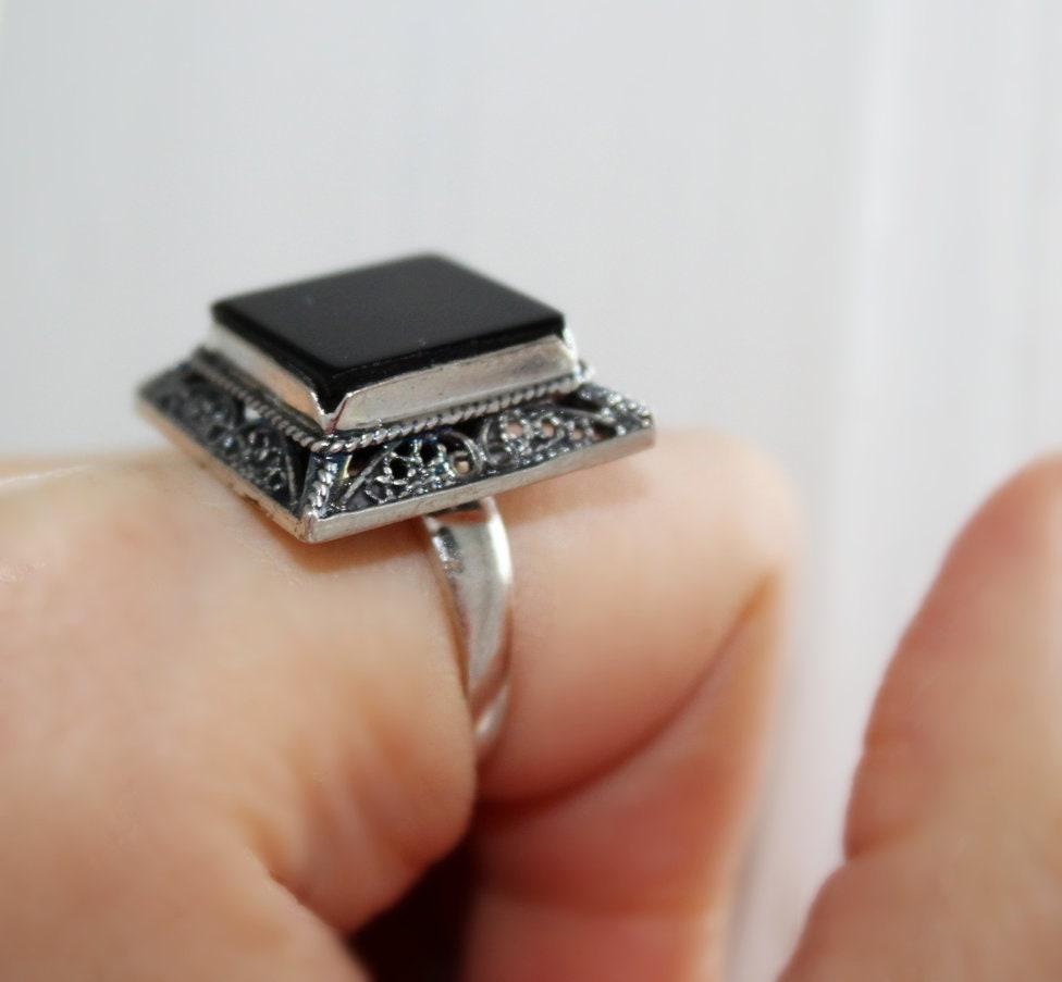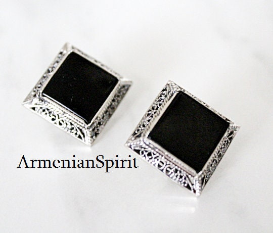 Upgrade your jewelry collection with these high-quality black onyx square earrings from the Armenian Spirit Etsy store. These vintage-style earrings add a touch of elegance to any outfit, and the black Victorian design and filigree pattern brings a unique and stylish element. Handcrafted with meticulous attention to detail, these earrings are a must-have for any medieval-inspired look. This hypoallergenic jewelry is perfect for sensitive skin and comes with free shipping worldwide. Shop confidently at Etsy, one of the top 5-star rated jewelry stores, for the best gifts for the special woman in your life.