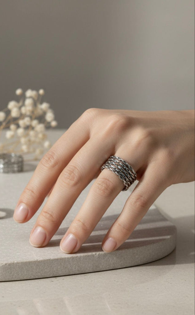 This wide band ring is handcrafted in Armenia from 925 sterling silver. The ring features a bold, modern design perfect for everyday wear. It weighs 2.5 grams and offers comfortable fit. This statement ring suits women who love minimalist jewelry. The wide band creates a striking look on any finger. Premium sterling silver ensures lasting quality. Each ring is carefully made by skilled artisans. Perfect gift for birthdays, anniversaries, or special occasions. Buy Armenian Spirit jewelry for authentic handmade pieces.