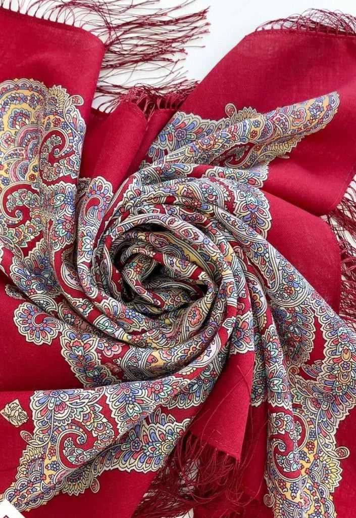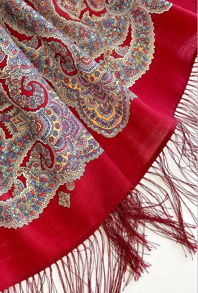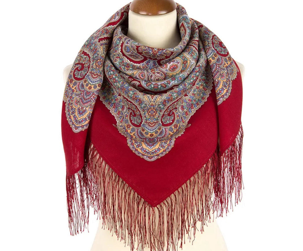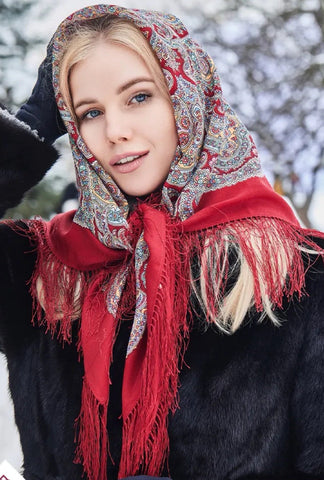 This square scarf is perfect for anyone who loves Slavic style. I’m a blond girl with sky-blue eyes, and this scarf is exactly what I was looking for! The wool is soft, cozy, and never irritates my skin—perfect for winter. The red background with the Slavic herbal pattern and silky fringe is just gorgeous. I usually wear it as a neck warmer, but when it’s really cold, I wrap it around my head and suddenly I feel like a blond Slavic girl straight out of a movie. People keep staring—I guess I nailed the look!