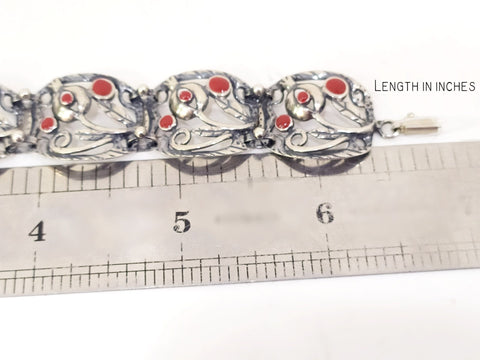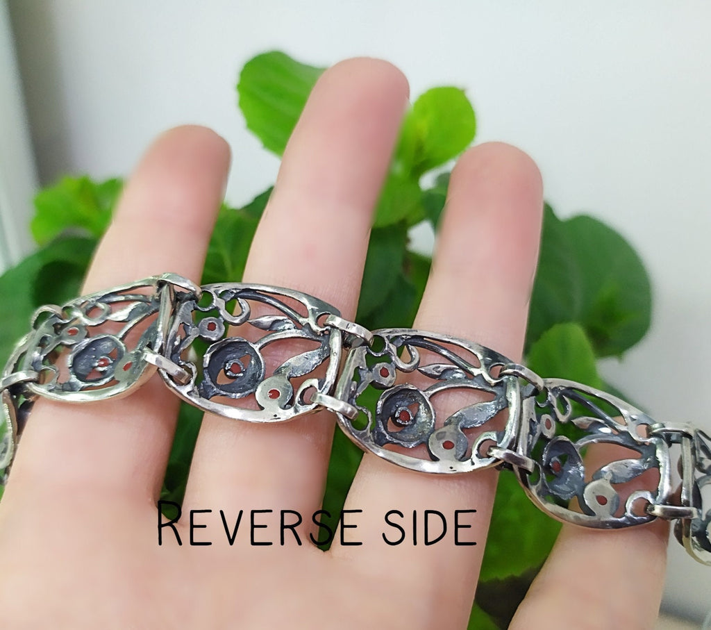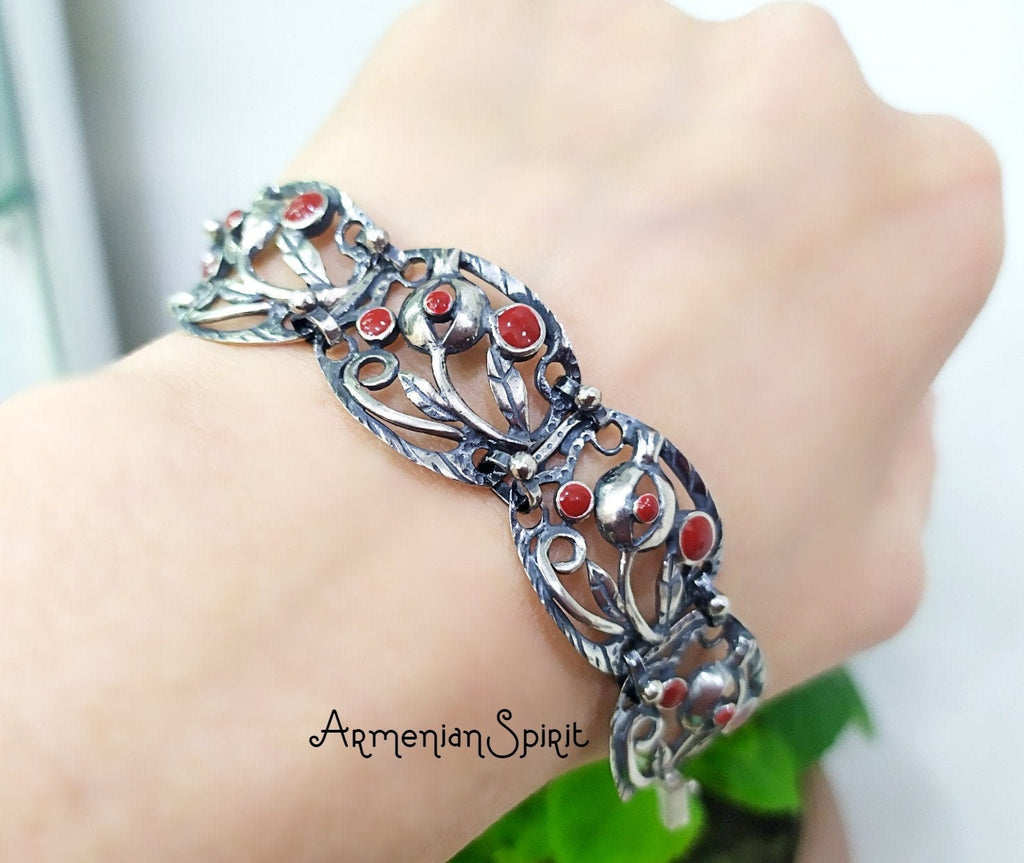 This wide SILVER bracelet is perfect for strong women who love unique jewelry. Made of sterling silver 925, it features beautiful pomegranates in red enamel to represent the goddess Persephone. A perfect gift for lovers of ethnic and Armenian jewelry. Sparkle and shine with our high quality, sterling silver 925 jewelry, featuring a large bracelet made just for women. Treat yourself to a touch of elegance and sophistication.